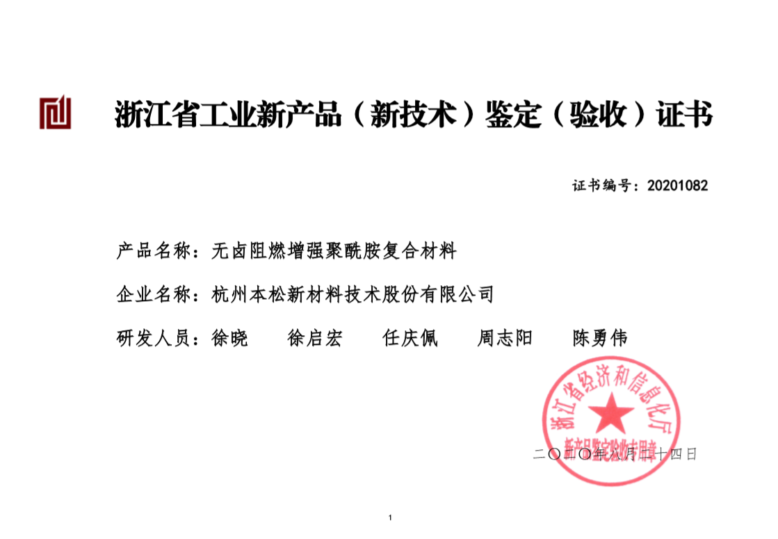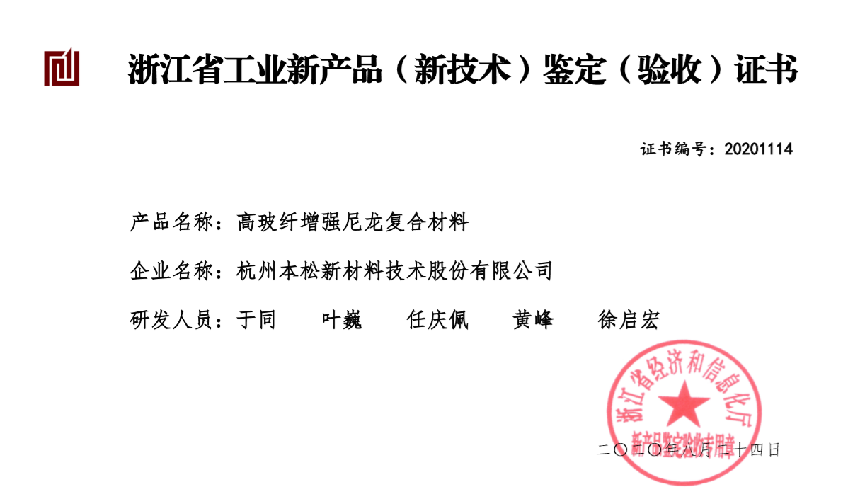 公司產(chǎn)品性能優(yōu)異、質(zhì)量穩(wěn)定,贏得了客戶的廣泛認可。根據(jù)中國塑料加工工業(yè)協(xié)會的統(tǒng)計,2019年、2020、2021年公司生產(chǎn)的無鹵阻燃增強聚酰胺復(fù)合材料在低壓電器應(yīng)用領(lǐng)域國內(nèi)市場占有率位居同行業(yè)第一位。2020年8月15日,浙江省科技廳下屬的浙江省技術(shù)經(jīng)紀人協(xié)會組織的專家鑒定會認定公司“氮磷阻燃增強聚酰胺復(fù)合材料”、“低成本高性能氮系阻燃聚酰胺復(fù)合材料”、“ 低磷化氫釋放量紅磷阻燃聚酰胺復(fù)合材料”三類產(chǎn)品已經(jīng)達到國際先進水平。2020年8月24日,浙江省經(jīng)濟和信息化廳出具的《浙江省工業(yè)新產(chǎn)品鑒定證書》,分別認定公司應(yīng)用于LED散熱領(lǐng)域的“高導(dǎo)熱尼龍復(fù)合材料”已經(jīng)達到了國內(nèi)領(lǐng)先水平,應(yīng)用于汽車發(fā)動機及周邊零部件的“阻燃增強PET復(fù)合材料”和“高玻纖增強尼龍復(fù)合材料”分別達到了國內(nèi)領(lǐng)先和國內(nèi)先進水平。2020年11月4日和2021年1月29日,中國輕工業(yè)聯(lián)合會專家鑒定會分別認定公司“阻燃增強耐高溫尼龍復(fù)合材料”、“高導(dǎo)熱尼龍基復(fù)合材料的產(chǎn)業(yè)化及應(yīng)用技術(shù)”達到了國際先進水平。