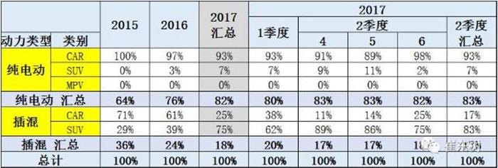 純電動(dòng)乘用車(chē)中基本是轎車(chē)產(chǎn)品,17年1-6月的插混SUV逐步增多,這也是新能源產(chǎn)品升級(jí)的體現(xiàn)。